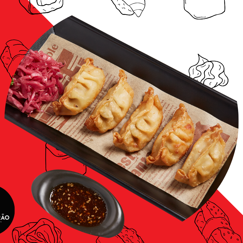 Recheio de carne bovina, repolho, cenoura, cebolinha, alho e gengibre.