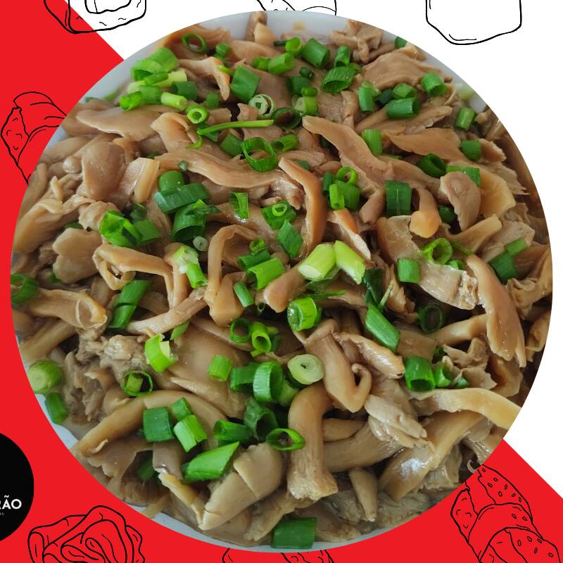 Cogumelos preparados na manteiga e shoyu, levemente adocicado, salpicados com cebolinha.