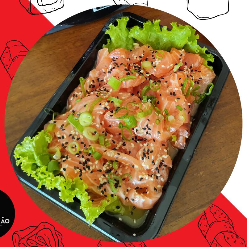 Pedaços de salmão, marinados no molho de limão, larnaja, azeite e gergelim, salpicado com cebolinha.