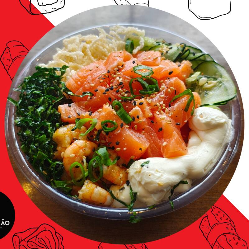 Arroz (de sushi) com de salmão, camarão (alho e óleo), cream cheese, sunomono, couve crispy, crispy de bifum, cebolinha e gergelim. Embalagem de 500ml.