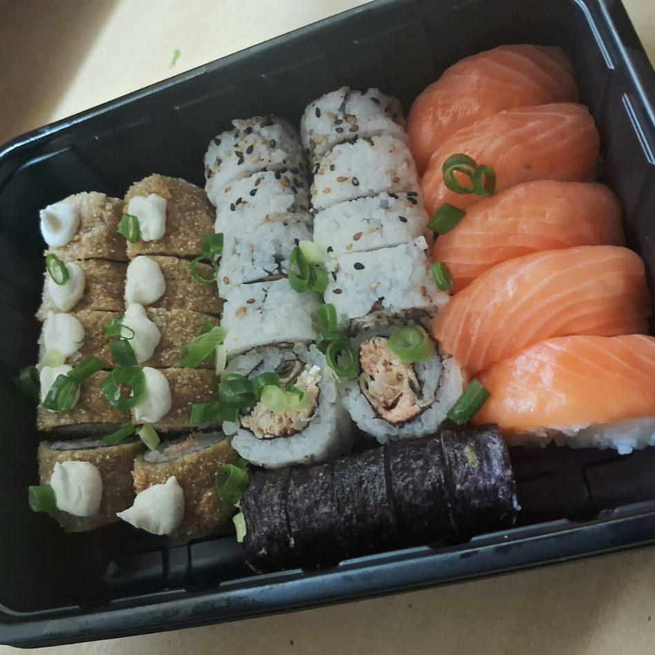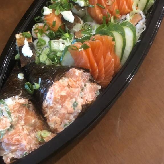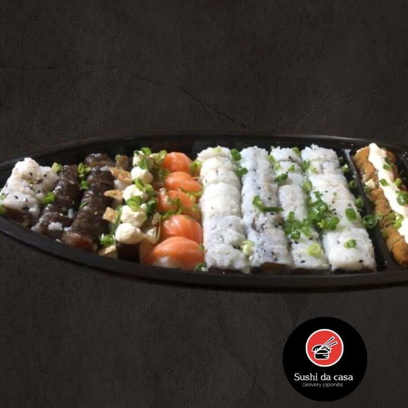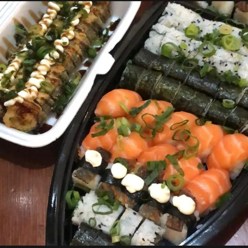 10 Uramaki de salmão 10 Hossomaki pepino 10 Uramaki salmão skin 10 Uramaki Califórnia 5 Niguiri Salmão 5 Niguiri salmão skin 5 Hossomaki pepino 10 deliciosos hot roll de salmão grelhado.OBS: Cebolinha só irá no combo se estiver disponivel na loja.