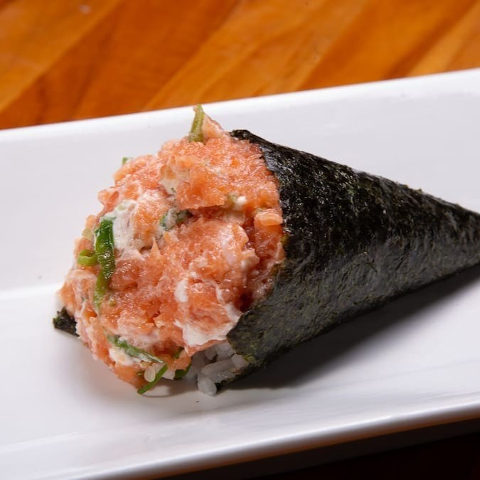 Delicioso cone recheado de arroz japonês , salmão cru fresco com cream Chease envolvido com alga .OBS:Cebolinha só irá no combo se estiver disponivel na loja.