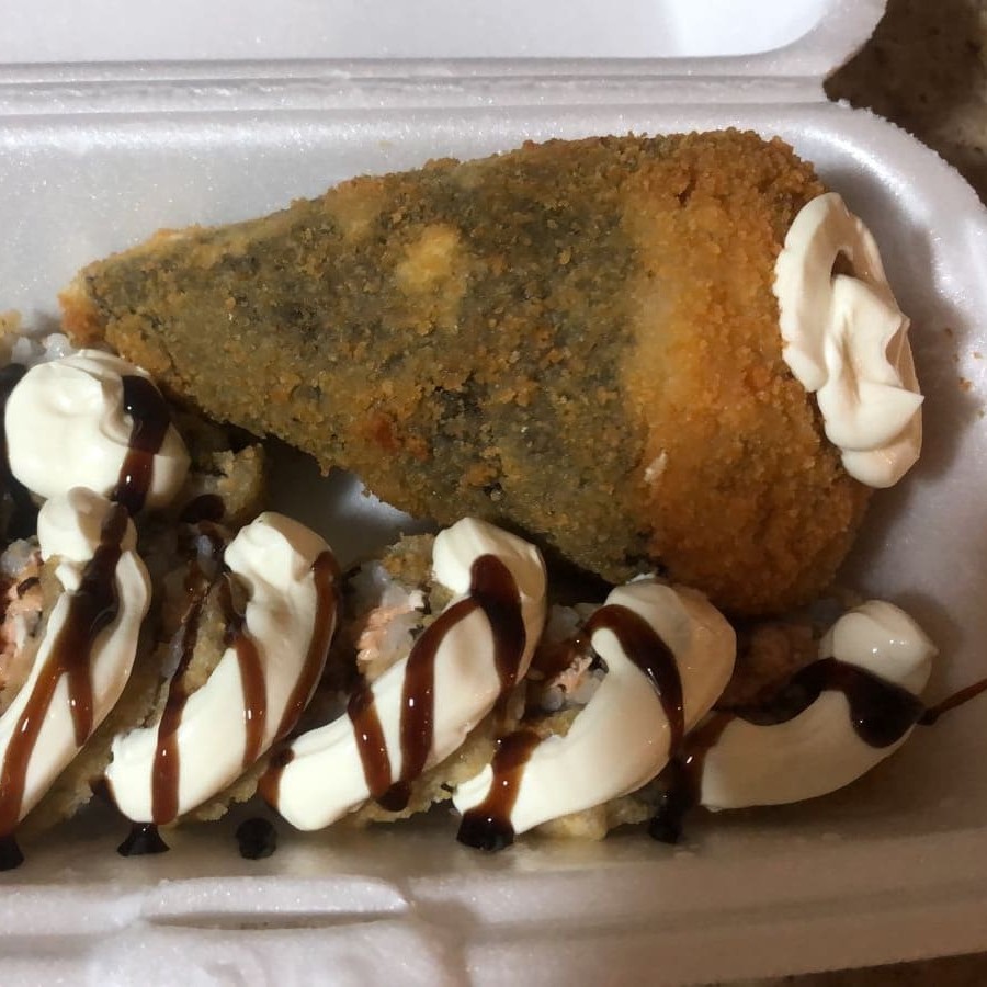 Delicioso arroz japonês empanado recheado com camarões empanados batidos com cream chease OBS:Cebolinha só irá no combo se estiver disponivel na loja.