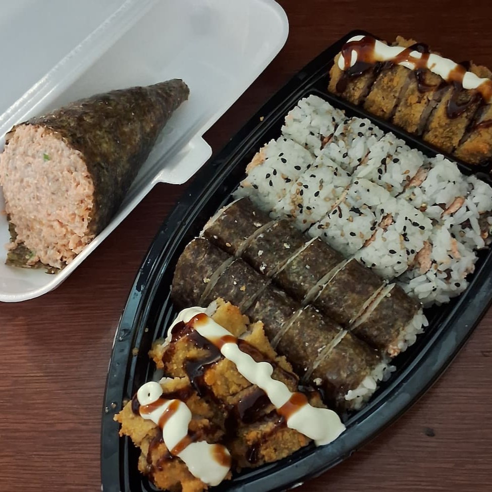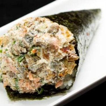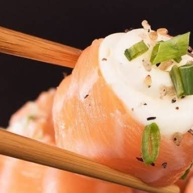 Delicioso cone recheado de arroz japonês , salmão grelhado com cream Chease envolvido com alga, frito .Cebolinha só irá no combo se estiver disponivel na loja.