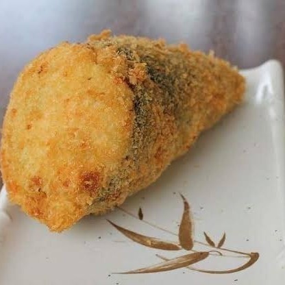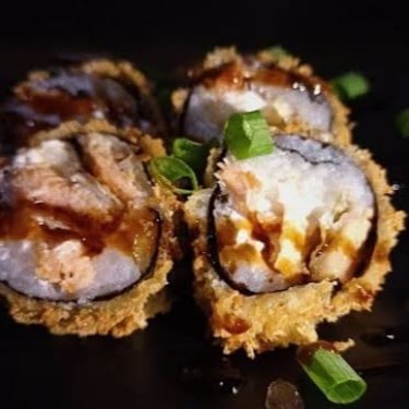 Delicioso arroz japonês empanado recheado com salmão cru , cream chease .OBS:Cebolinha só irá no combo se estiver disponivel na loja.