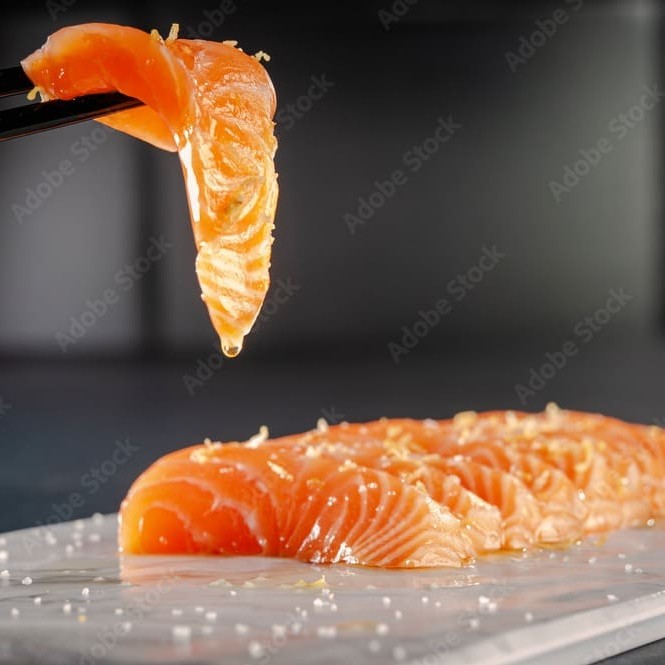 4 deliciosos joy de salmão ( arroz japonês envolvido com filé de salmão cru com recheio de geleia de pimenta )