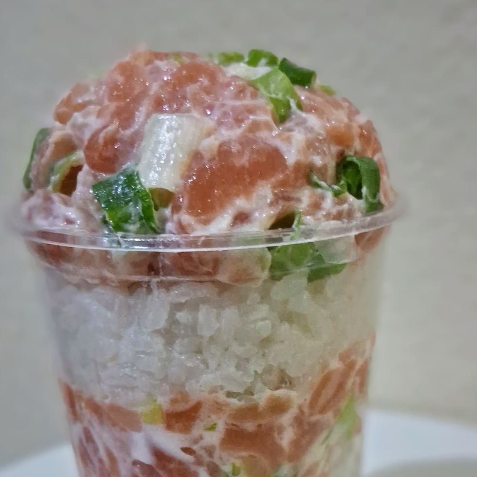 Copo 300 ml recheado de arroz japonês, cream chease e salmão cru fresco OBS: Cebolinha só irá no combo se estiver disponivel na loja.