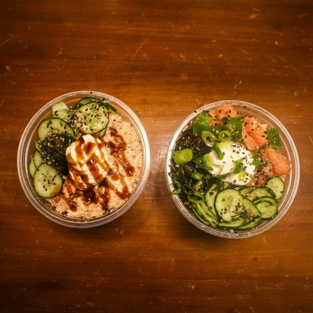Desfrute do nosso poke com base de Shari, salmão em cubos empanados e fritos, couve crispy, sunomono, creme cheese, gergelim e molho tarê. Uma combinação saborosa e crocante que promete surpreender seu paladar. Ideal para quem aprecia a fusão de sabores na culinária.