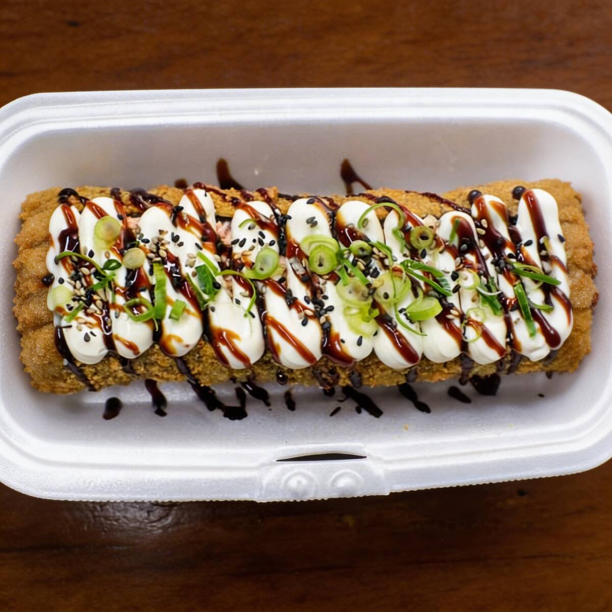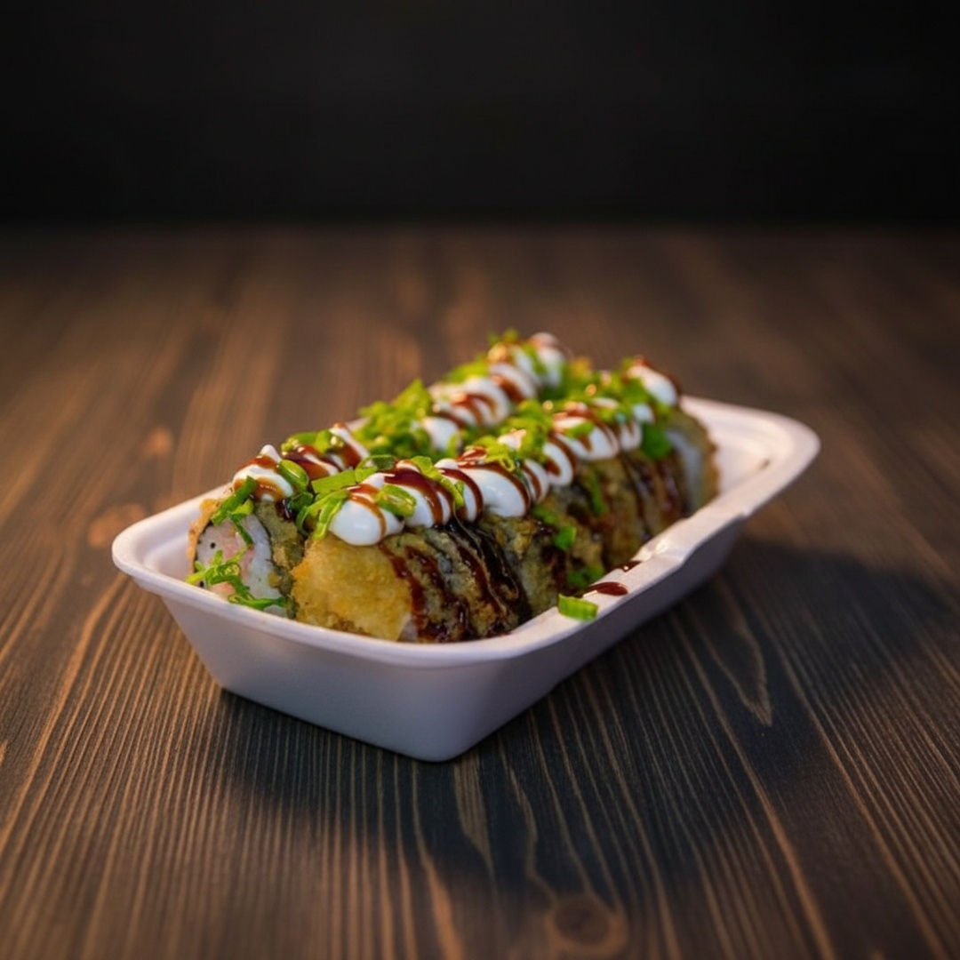 Temaki de salmão grelhado, empanado e frito, cortado ao meio e recheado com cream cheese, finalizado com molho tarê e cebolinhas. Uma combinação deliciosa que traz frescor e crocância em cada pedaço.