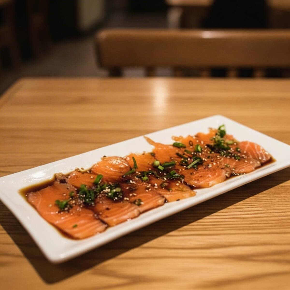 Delicie-se com nossas fatias de salmão acompanhadas de molho ponzo! Acompanha 2 molhos tare, 2 molhos shoyu e 1 hashi. Uma explosão de sabores