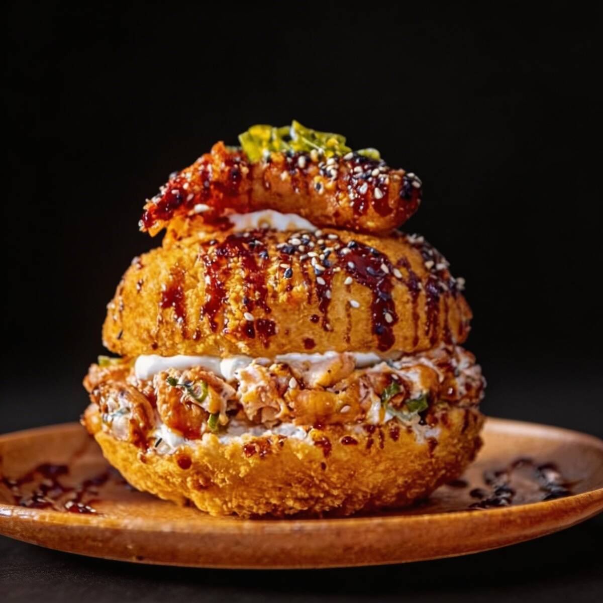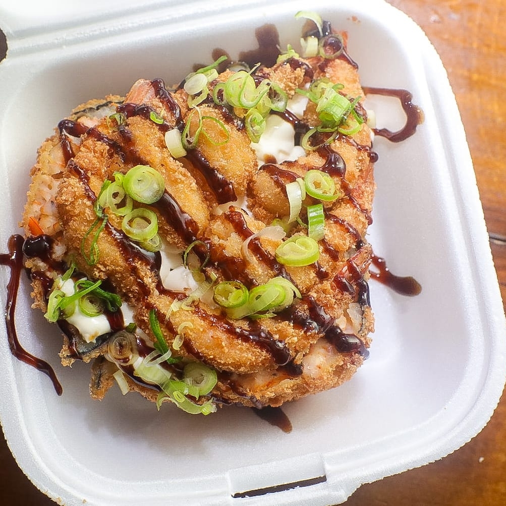 Temaki de camarão, empanado e frito, cortado ao meio e recheado com cream cheese, finalizado com camarões encima, molho tarê e cebolinha. Uma combinação deliciosa que traz frescor e crocância em cada pedaço.