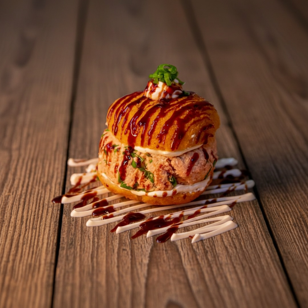 Experimente nosso irresistível bolinho de massa leve, recheado com salmão grelhado e cream cheese, finalizado com molho tarê e um toque de cebolinha. Uma explosão de sabores que vai encantar o seu paladar!