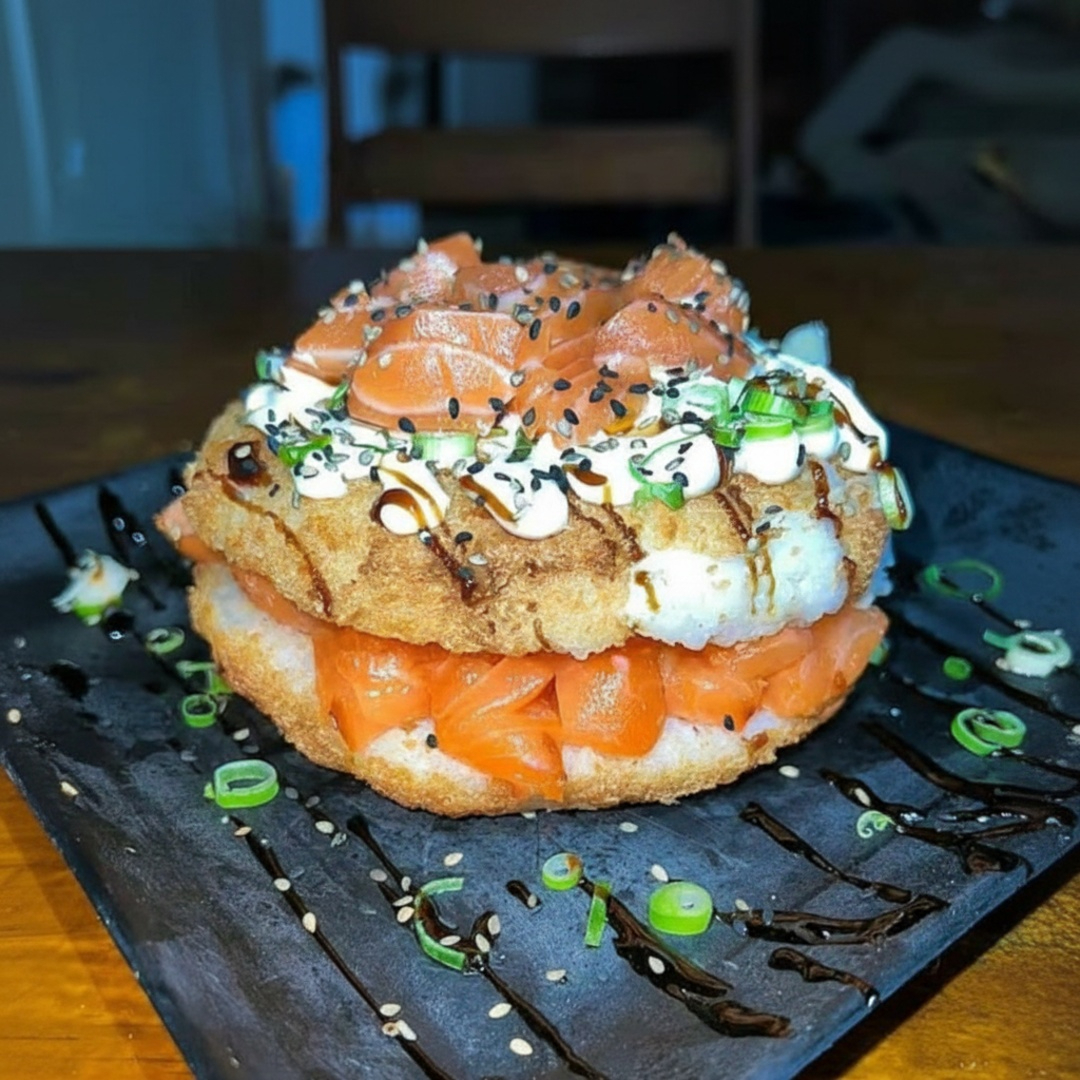 Desperte seu paladar com o Sushi burguer de Salmão grelhado! Camadas suculentas de camarão fresco, cream cheese e cebolinha, envoltas em um irresistível "hambúrguer" de sushi. Acompanha 2 molhos shoyo e 2 tare. Uma explosão de sabores em cada mordida!