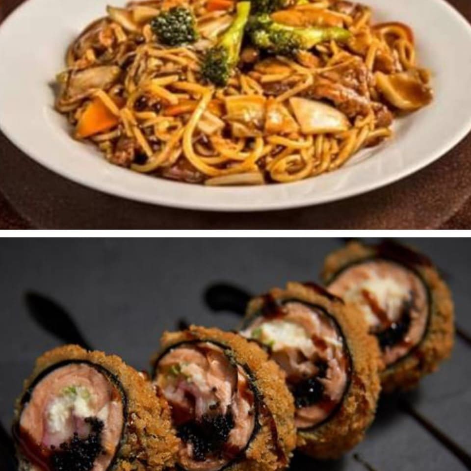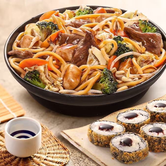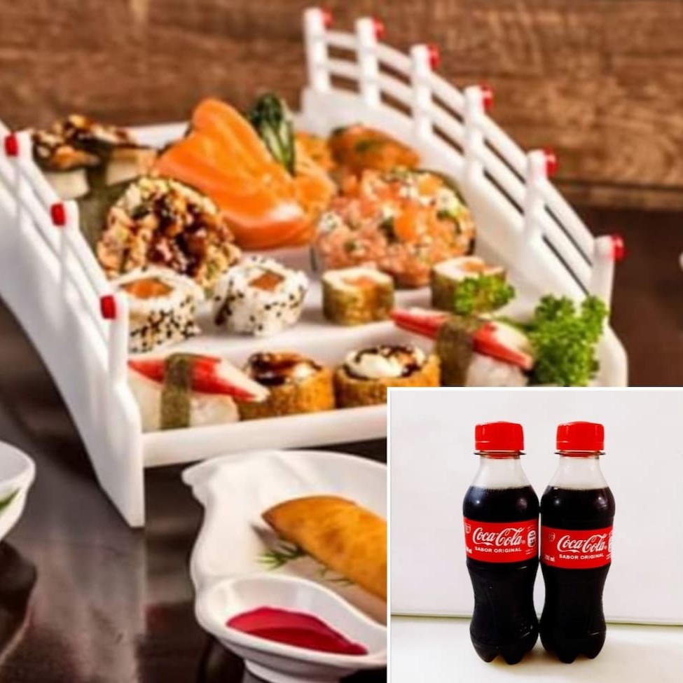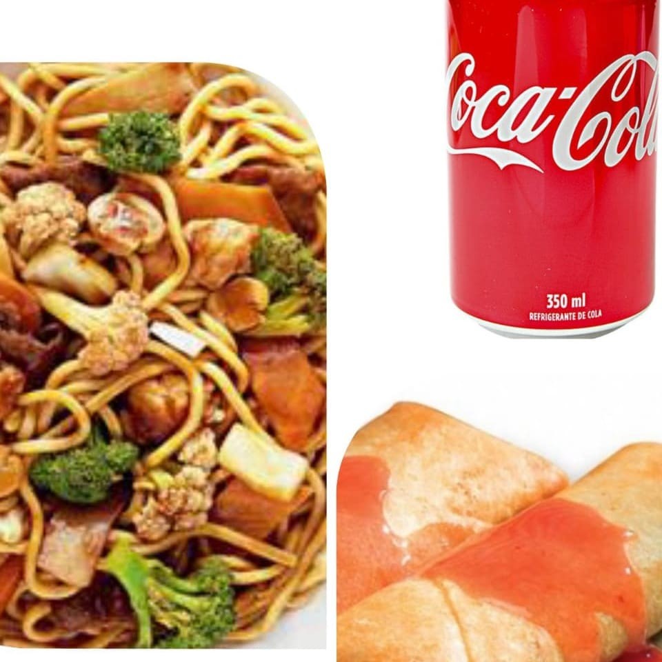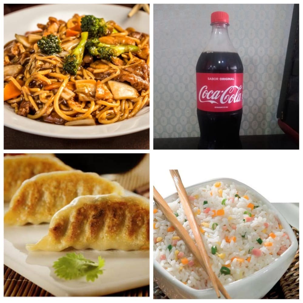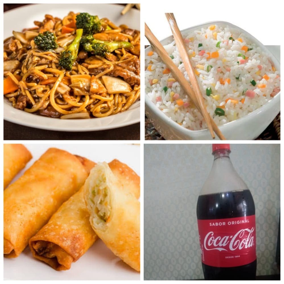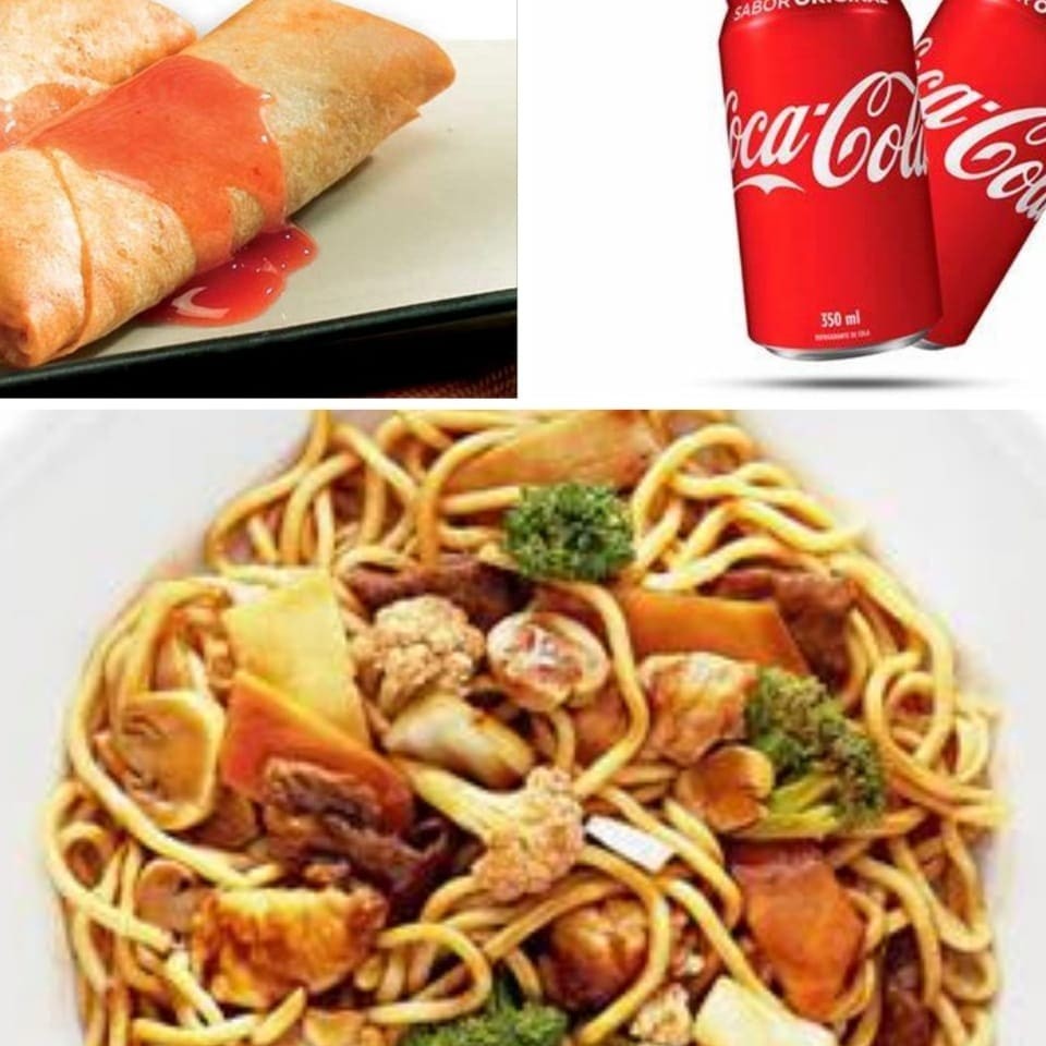 1 Yakissoba clássico padrão 1 Yakimeshi padrão 4 unidades de rolinho primavera 1 coca 2 litro