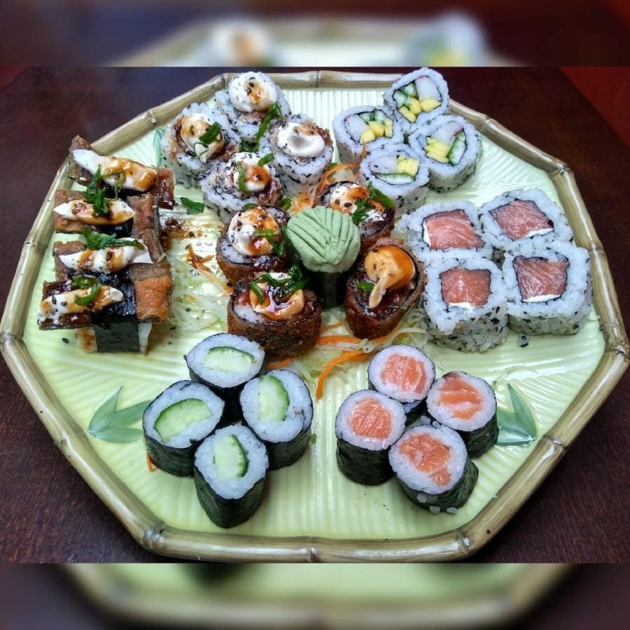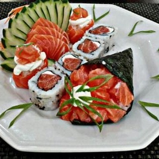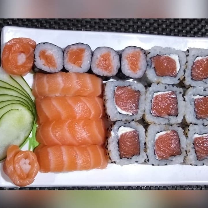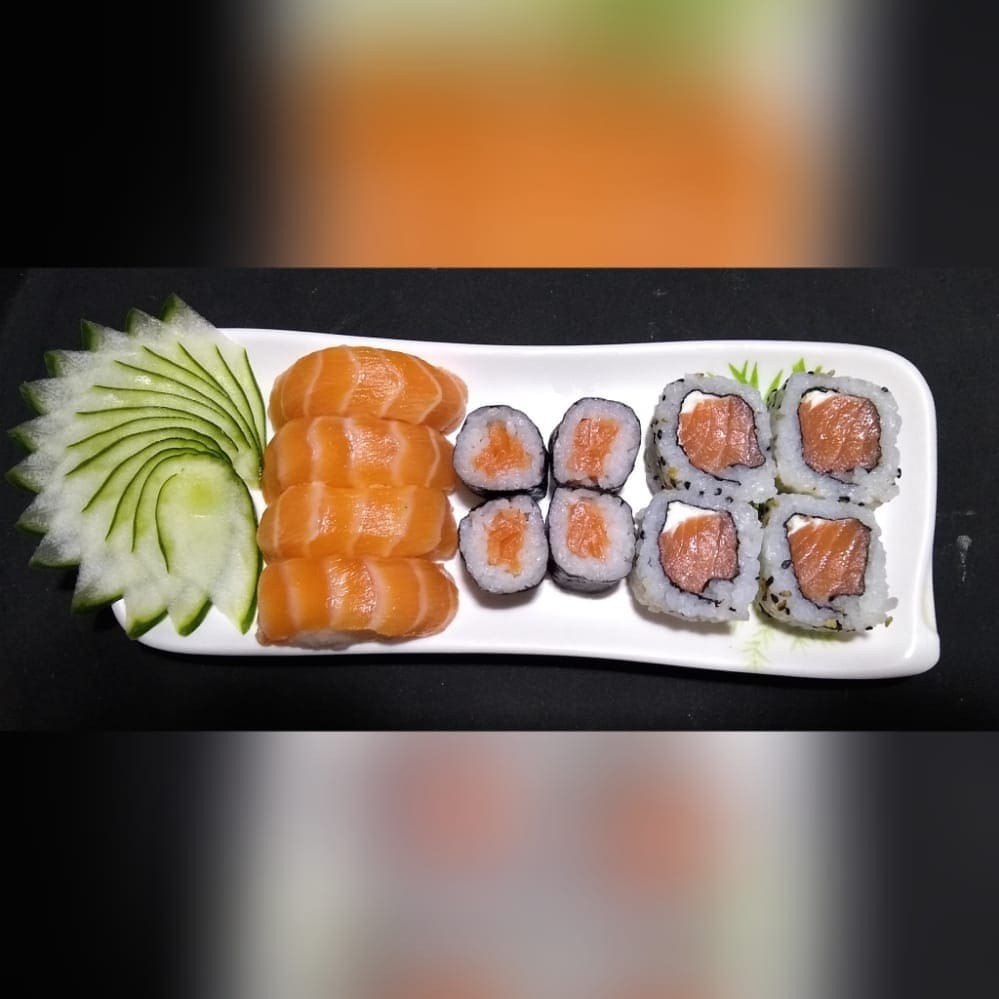 20 unidades - 10 sashimis de salmao, 4 niguiris, 2 hossomakis, 2 uramkis e 2 dyou.