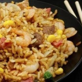 Risoto chinês, carne desfiada, ovos, ervilha, cebola e cenoura ecamarão temperado ao molho de soja
