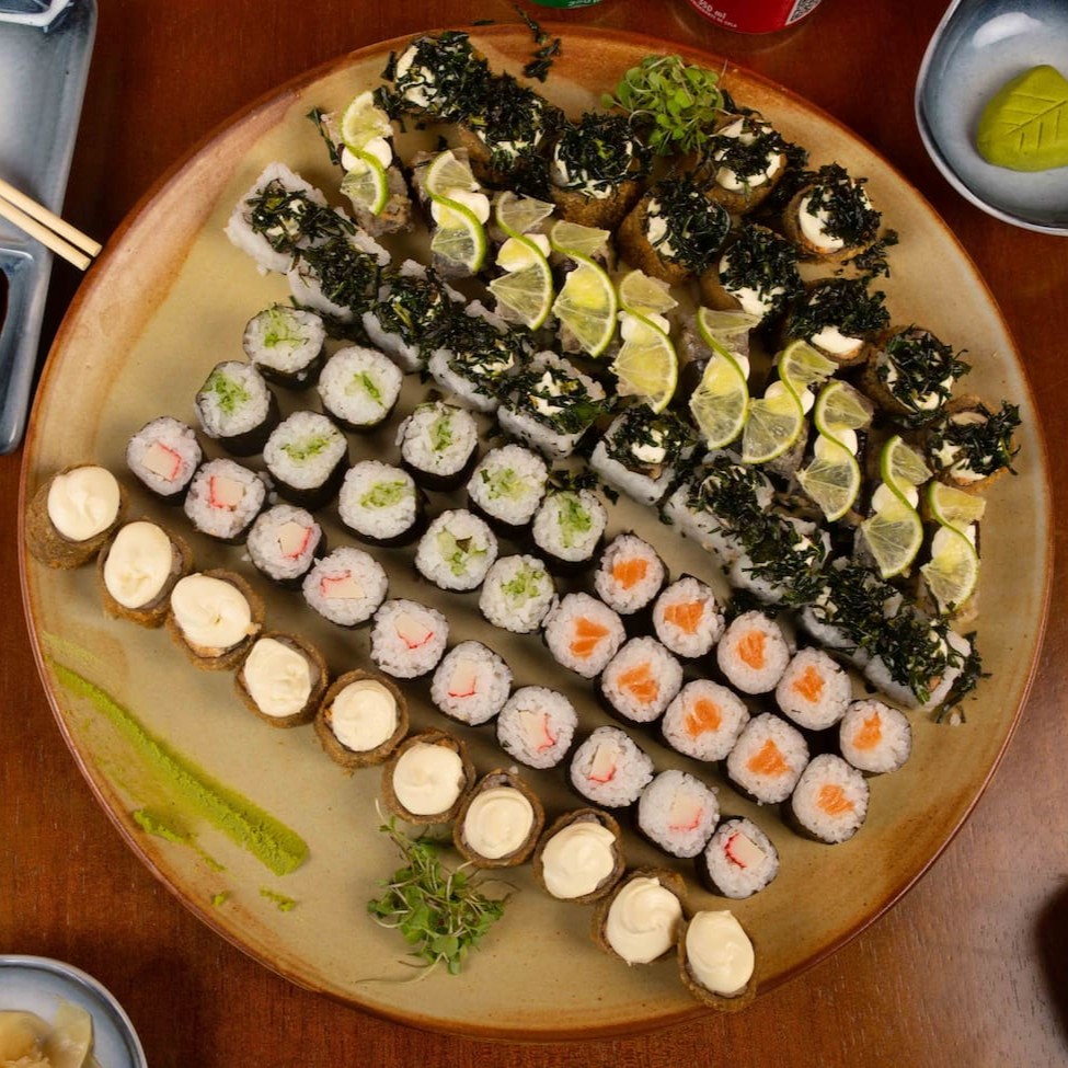10 hossomaki de salmão / 10 hossomaki pepino/ 10 uramaki skin com couve crispy / 5 Uramaki Skin batata crispy / 5 uramaki california/ 10 Kapamaki / 30 Hot Roll