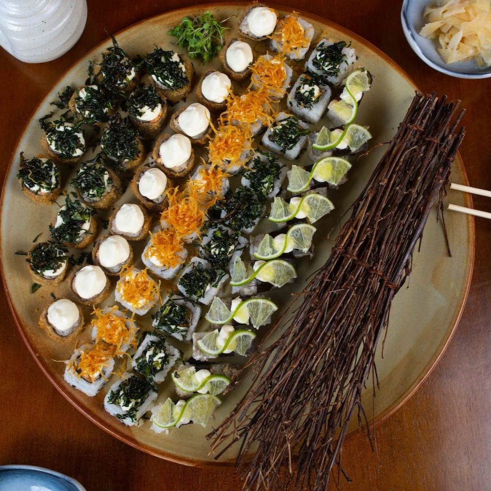 Enrolado de arroz com pele de salmão frita.