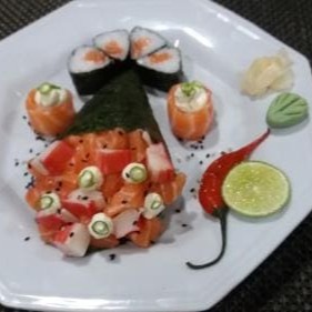 1 temaki salmão completo, 3 sashimis de salmão, 2 dyou de salmão, 4 uramaki de salmão.