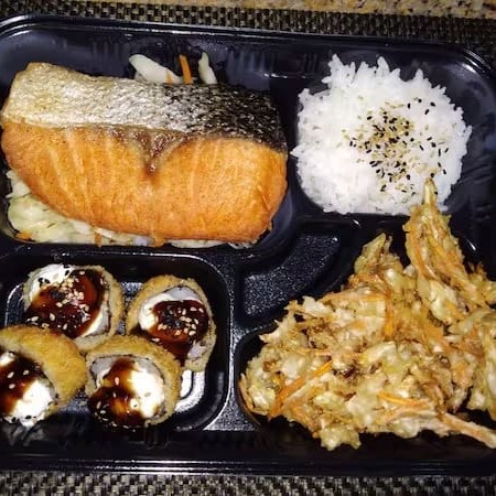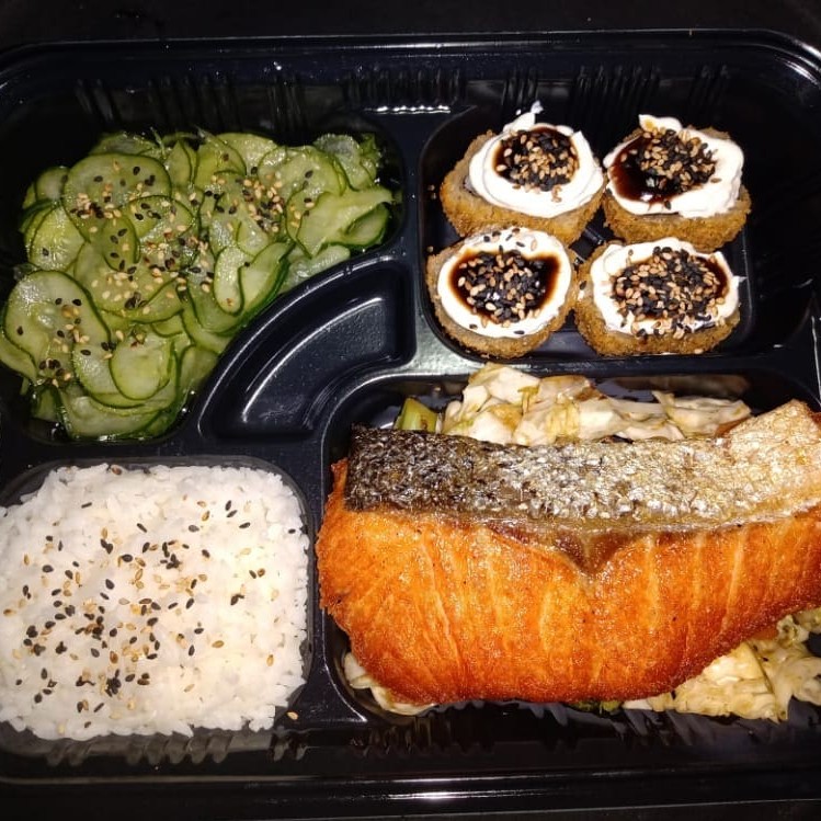 Delicioso salmão grelhado acompanhado de gohan, sunomono e 4 unidades de hot holl