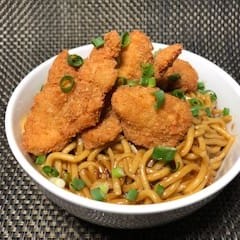 Macarrão com molho a base de shoyu,com pedaços de frango crispy e cebolinha picada