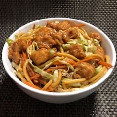 Macarrão com filé de peito em cubos com repolho e cenoura desfiados ao molho a base de shoyu