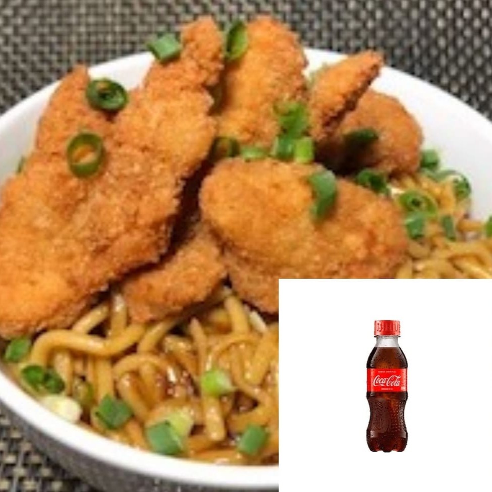 Macarrão com molho a base de shoyu, com pedaços de frango crispy e cebolinha picada, leve de brinde 1 coca cola 200 ml