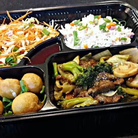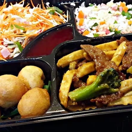 Carne c/legumes, yakimeshi, frango empanado e salada especial + coca cola 350ml