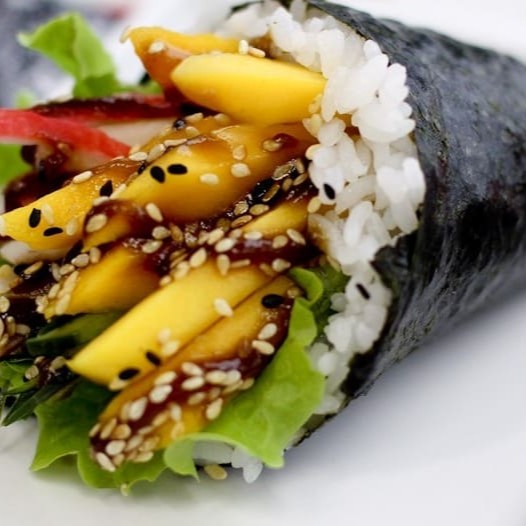 Enrolado de arroz com pepino, manga e kani.