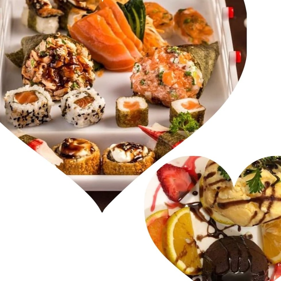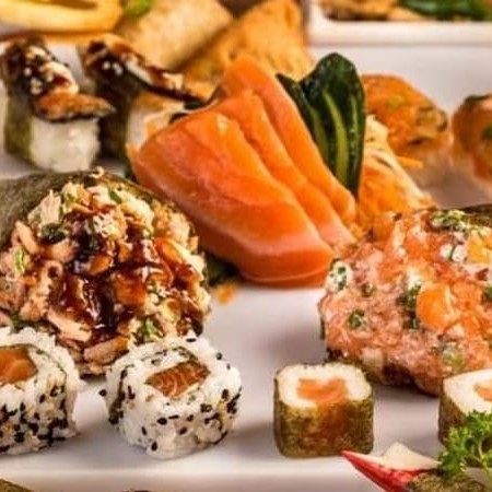 Nosso Rodizio vai acompanhado de 1 temaki salmão crú, 1 temaki salmão grelhado , 3 sashimis de salmão, 2 hot holl, 2 uramaki de salmão, 2 hossomaki de salmão, 2 baterá, 2 nigueri salmão, 2 dyou salmão + 2 rolinho primavera1 porção de shimeji ( tamanho pardrão rodizio) 2 guioza frito .. Vc leva de brinde 2 h20 limão 500 ml