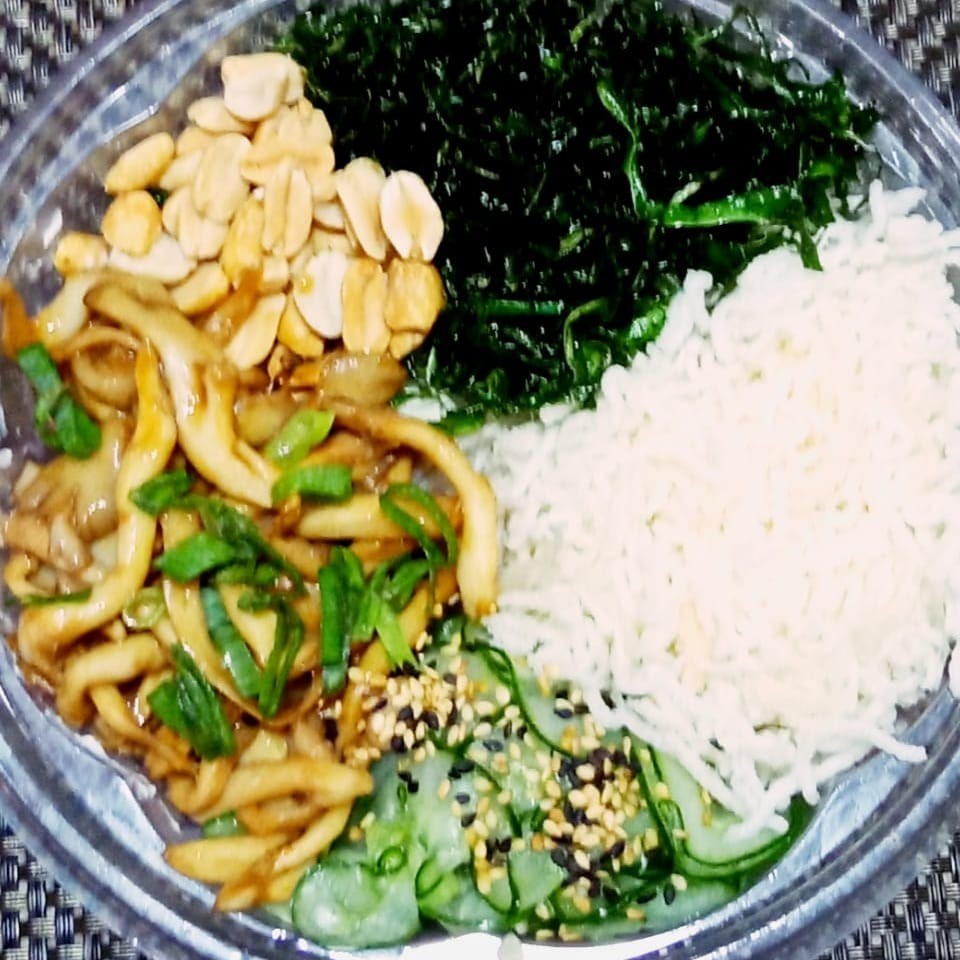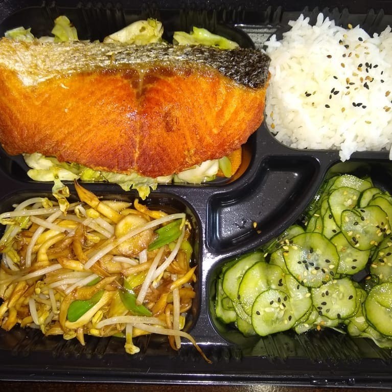 Delicioso salmão,grelhado gohan, shimeji e sunomono.
