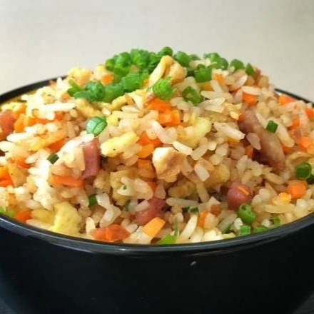 Risoto chinês com presunto, ovos mexidos, cenoura e cebolinha picada