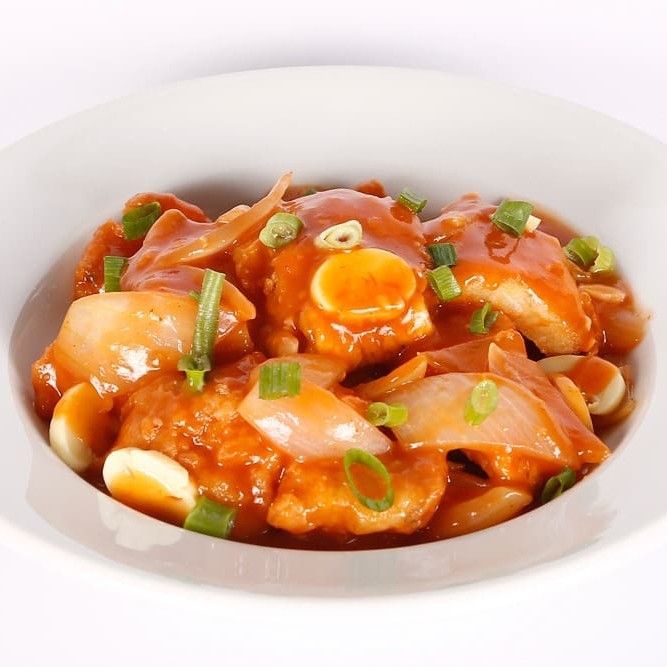 Pedaços de filé de peixe, cebola, champignon ao molho de tomate levemente picante