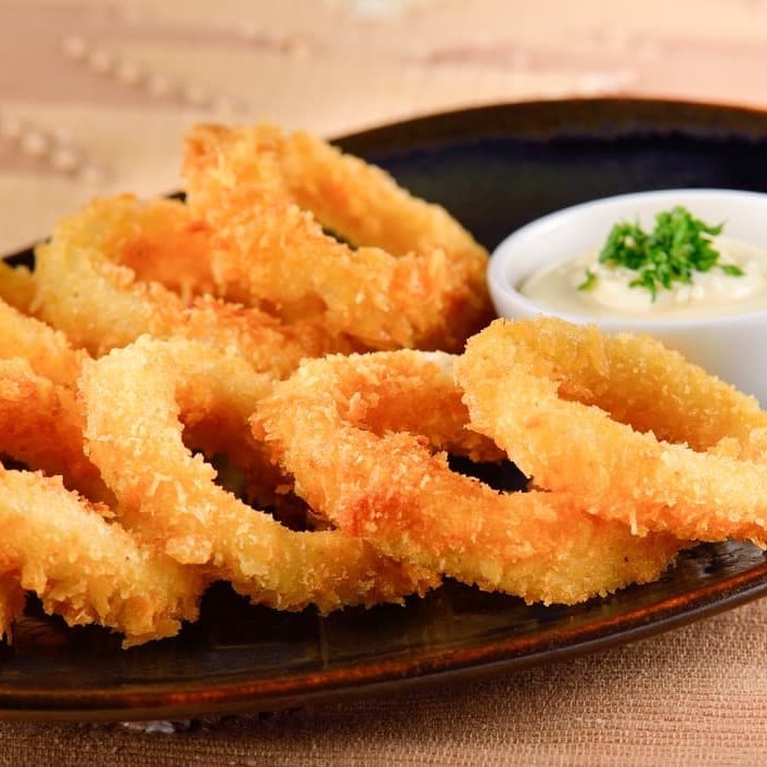 Anéis de lulas empanado servidos com molho especial
