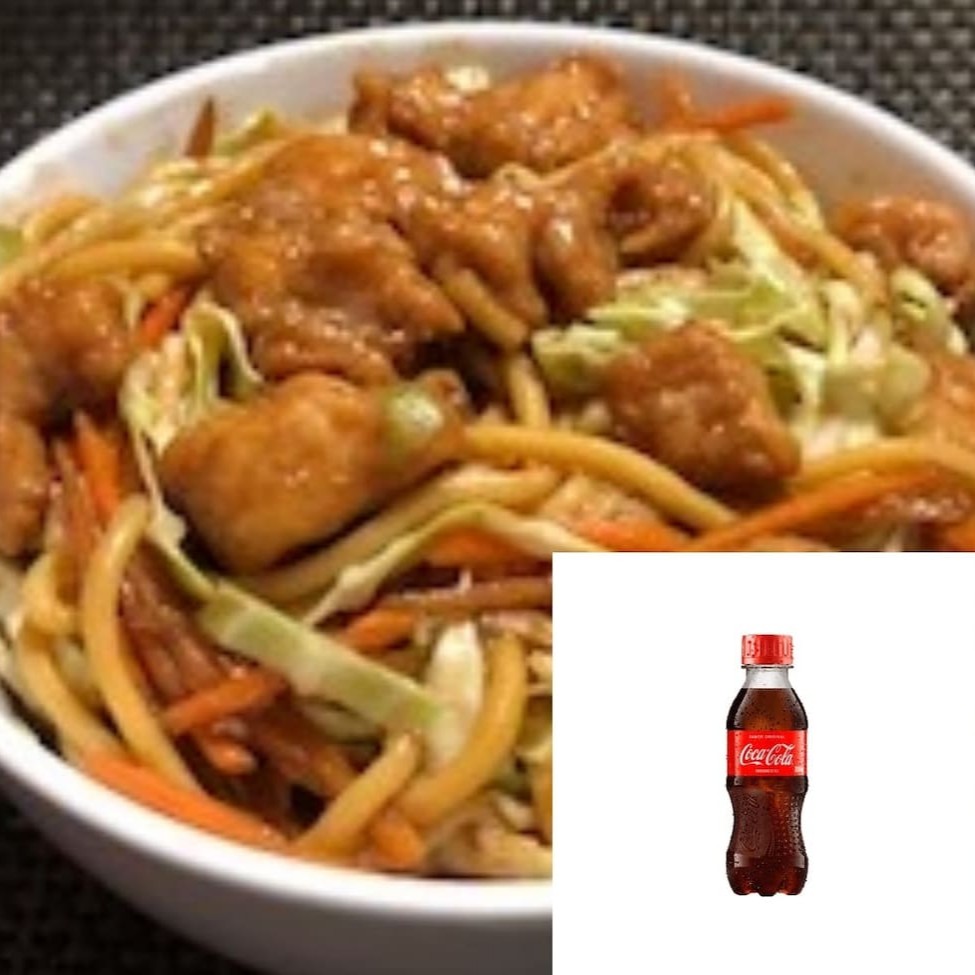 Macarrão com filé de peito em cubos com molho a base de shoyu, você leva de brinde 1 coca cola 200 ml