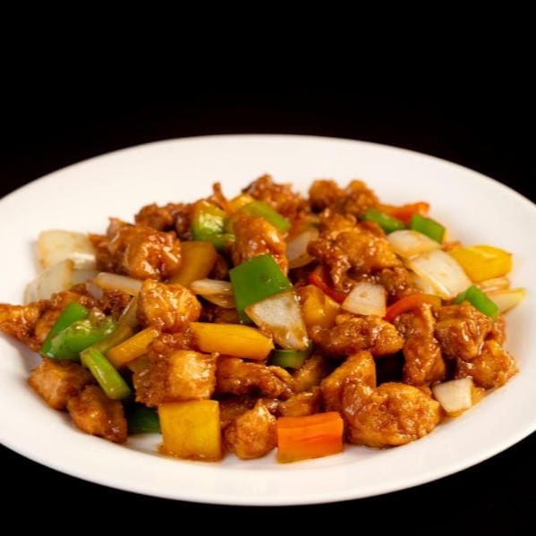 Saborosos pedaços de filé de peixe frito, combinados com legumes selecionados ao molho de soja