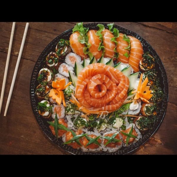 10 fatias de sashimi - 05 hot roll com cebolinha - 05 hot roll com couve - 05 hot roll com batata - 05 niguiri de salmão cru - 05 uramaki de salmão cru - 05 hosomaki de salmão cru - 05 hosomaki de pepino - 05 hosomaki de kani