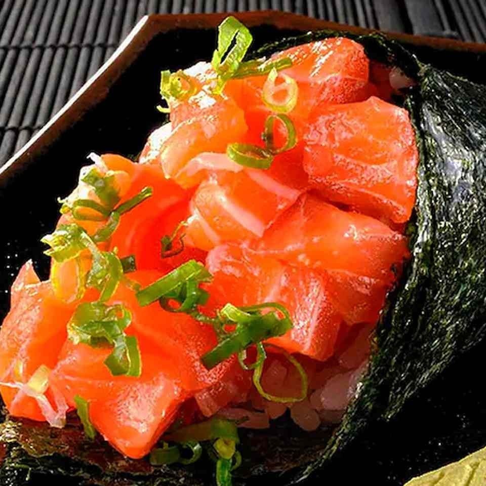 - 01 temaki hot de salmão grelhado - 10 hot roll de salmão grelhado com cebolinha Contém cream cheese e molho tarê