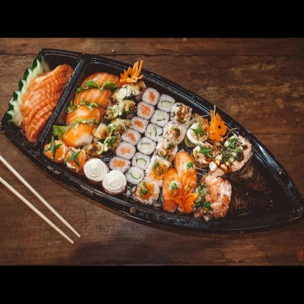 - 08 fatias sashimi salmao - 04 uramaki de salmão grelhado - 04 uramaki de salmão cru - 04 niguiri de salmão cru - 04 joy de salmão cru - 04 hosomaki de salmão cru - 04 hot roll de salmão grelhado com cebolinha - 04 baterá de salmão - 01 temaki salmao grelhado