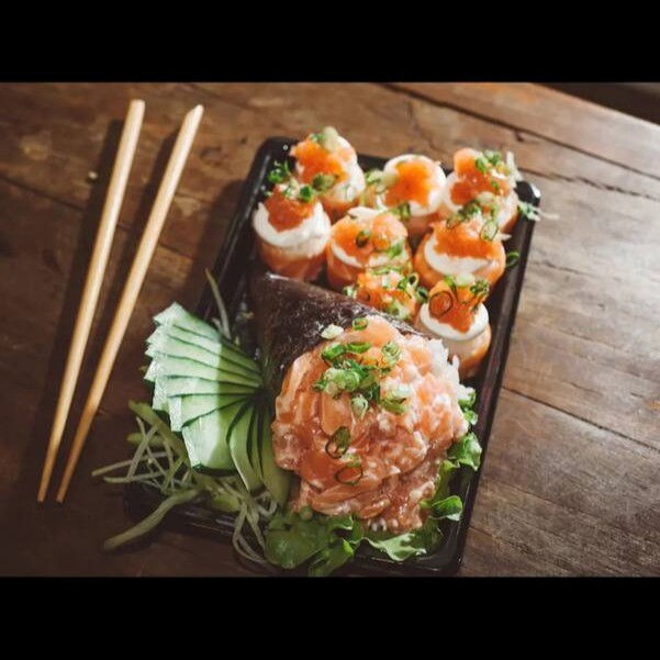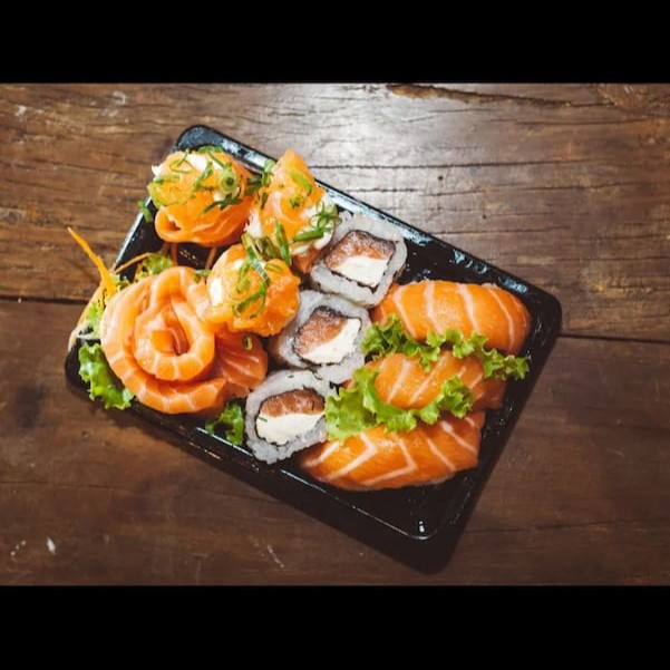 - 03 niguiri de salmão cru - 03 uramaki de salmão cru - 03 sushi joy - 03 fatias de sashimi