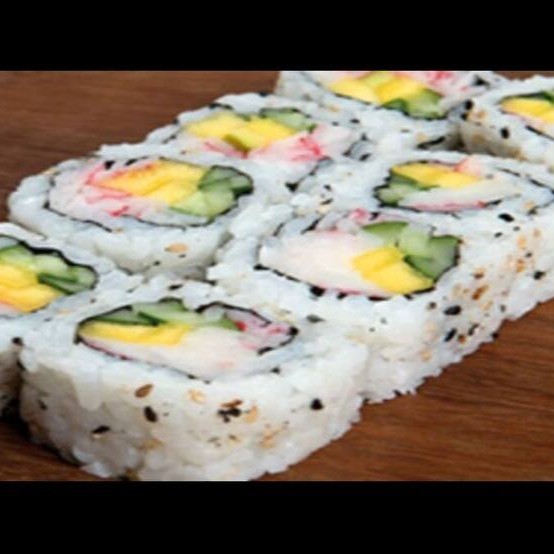 10 Unidades Enrolado com arroz por fora, com kani manga e pepino 01 hachi 01 sache de molho shoyu 01 sache de molho tare. Este prato não pode sofrer alteração