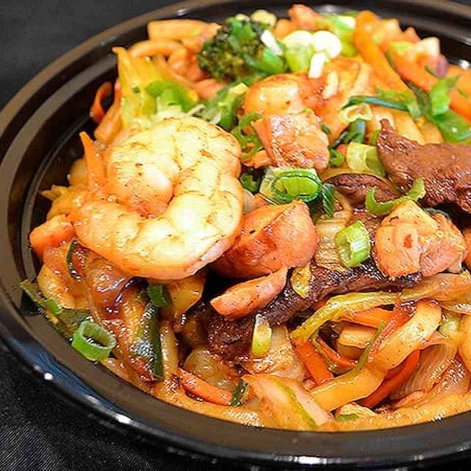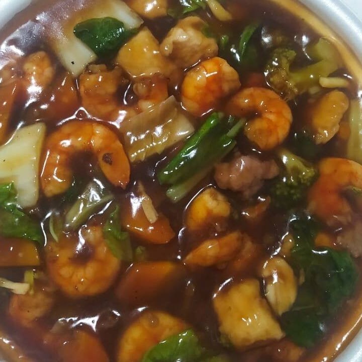 Macarrão oriental com carne, frango e camarão legumes ao molho de soja. Contém acelga, brócolis, cenoura e repolho.