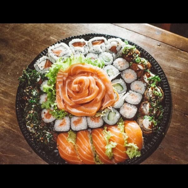 - 10 fatias de sashimi - 05 hot roll com cebolinha - 05 hot roll com couve - 05 hot roll com batata - 05 niguiri de salmão cru - 05 uramaki especial de salmão cru - 05 uramaki skin - 05 uramaki de salmão grelhado - 05 hosomaki de salmão cru