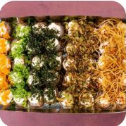 5 uramaki com Doritos, 5 uramaki com couve crispy, 5 uramaki com batata crispy, 5 uramaki com cream cheese e cebolinha