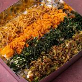 Macarrão, carne bovina, frango, frutos do mar e legumes.