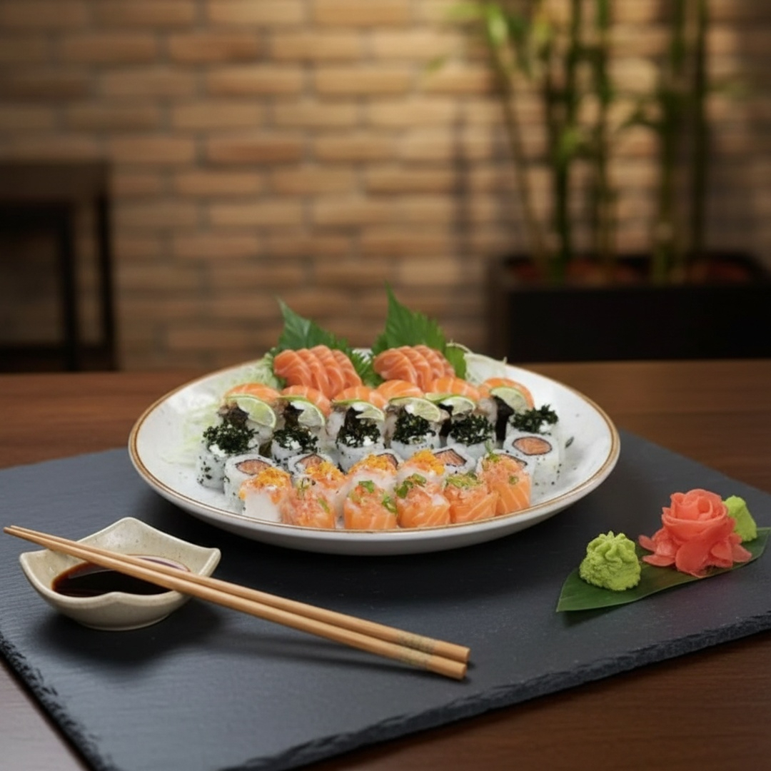 5 sashimi salmao + 5 niguiri salmao + 5 uramaki salmao + 10 hossomaki salmao