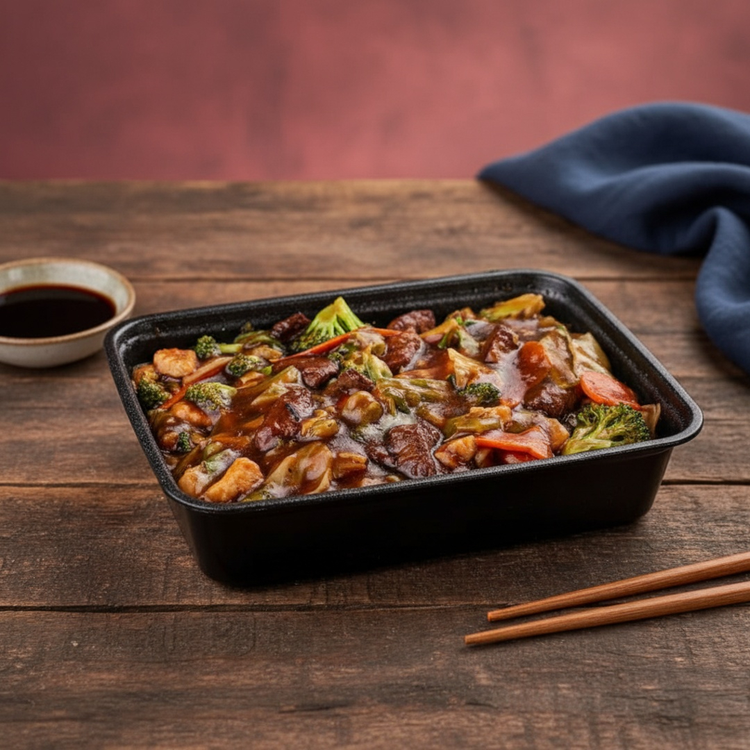 Macarrão, Carne Bovina, Frango, Legumes e Molho.
