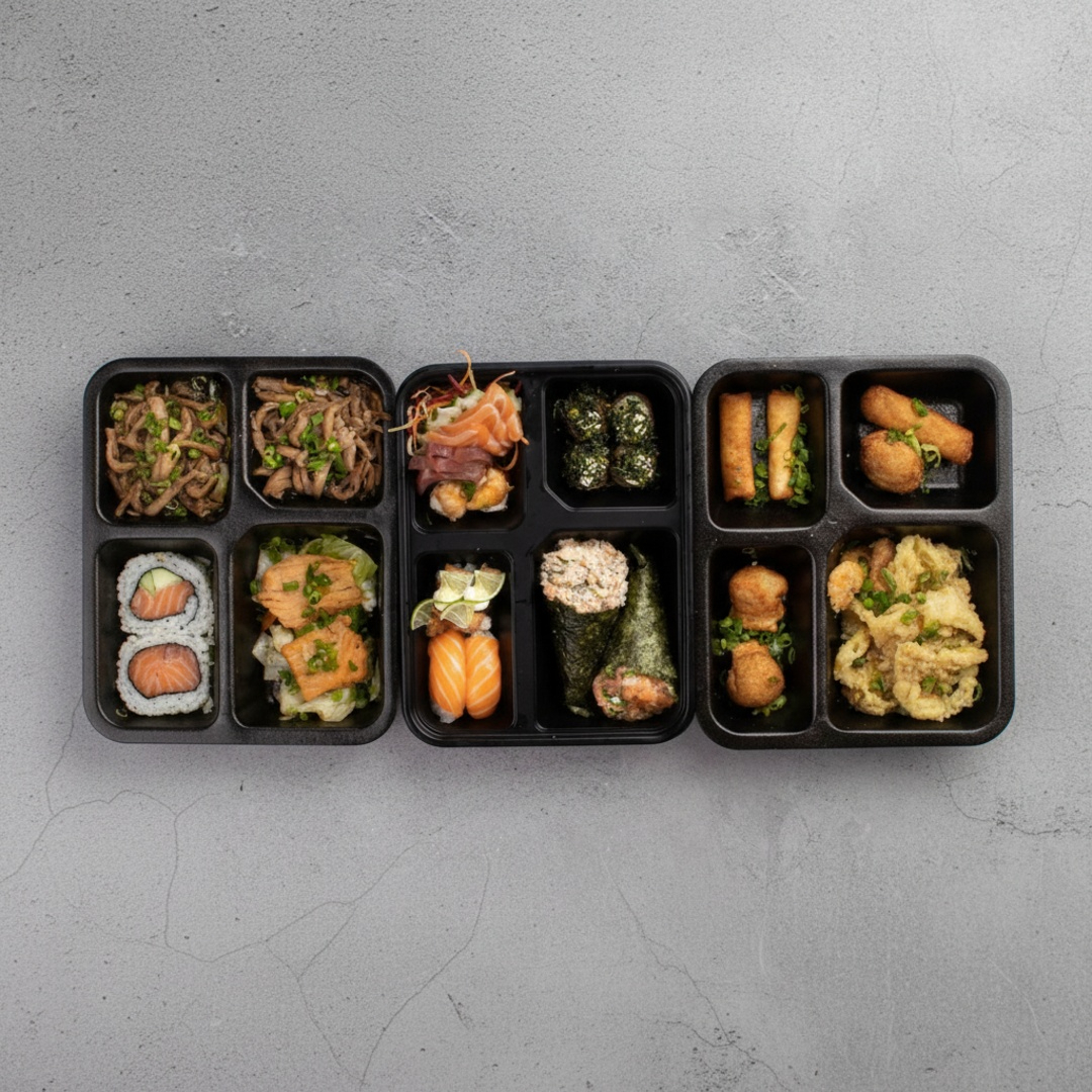 6 Sashimi 2 Jhous 2 niguiri skin 2 Niguiri salmão 4 Hot Hol 2 Temaki 100g a escolha do cliente 2 Guioza 2 Harumaki De Queijo 2 Salmões Grelhados com legumes 1 Shimeji 100g