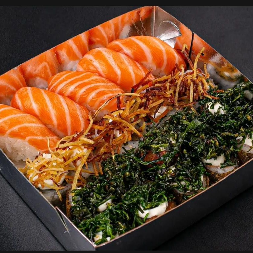 Descubra a delicadeza e a explosão de sabores do nosso combo promocional, composto por 10 hot rolls crocantes, envoltos por uma deliciosa camada de couve crispy. Acompanha 5 niguiris de salmão, frescos e suculentos, que derretem na boca. E para completar, saboreie 5 uramakis Filadélfia, recheados com cream cheese e envoltos por batata crispy, que proporcionam uma experiência gastronômica única e irresistível. Este é um prato perfeito para os amantes da culinária japonesa que procuram por uma combinação de sabores autênticos e texturas incríveis.