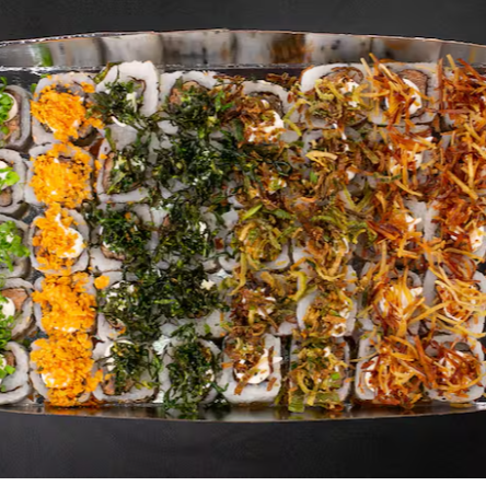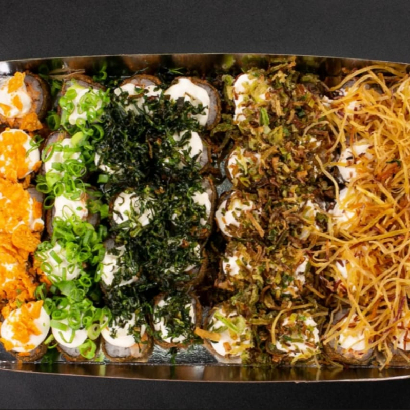 5 uramaki com Doritos, 5 uramaki com couve crispy, 5 uramaki com batata crispy, 5 uramaki com cream cheese e cebolinha